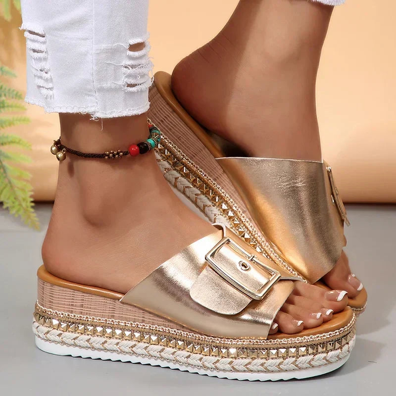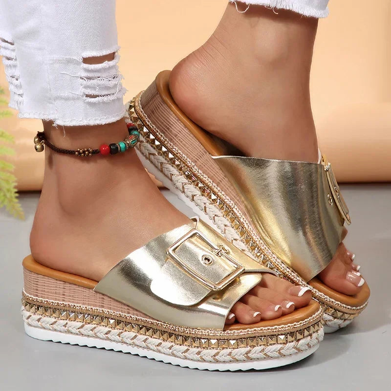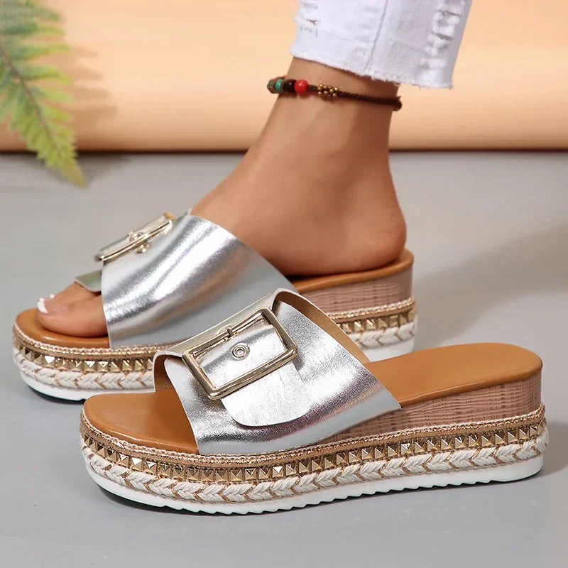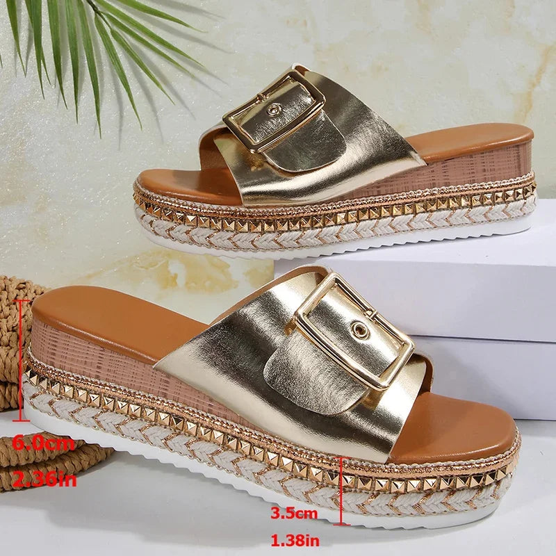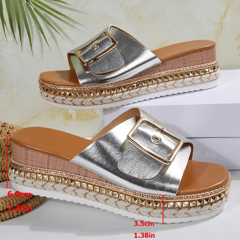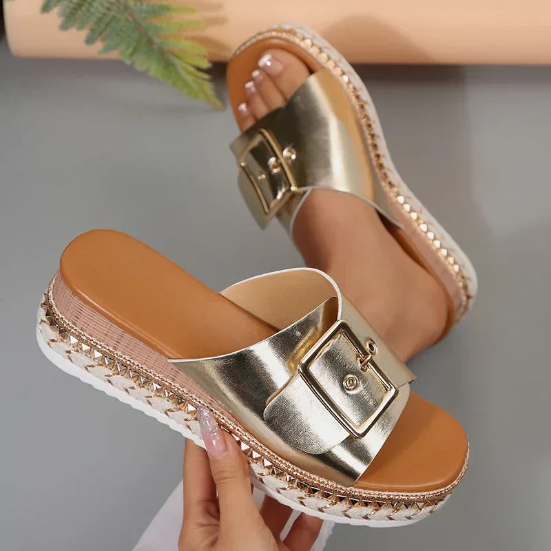 Metal Buckle Platform Slippers